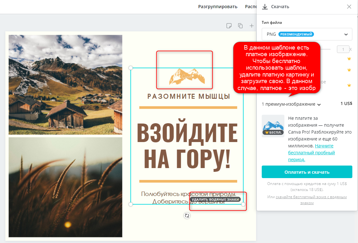 Уважаемые читатели! Рекомендую хорошенько разобраться в работе сервиса. Как и говорится в статье, Canva дает возможность создавать бесплатно множество уникальных дизайнерских решений, но есть и платные функции. Премиальными функциями пользуются корпоративные клиенты сервиса или те, кто часто использует данный сервис. Но для обычных посетителей доступны все шаблоны, но платными являются лишь некоторые изображения. Когда вы выбираете шаблон на нем будет указано, что он бесплатен. Если же шаблон платный, то вы им также сможете воспользоваться, но необходимо будет удалить платные картинки и установить вместо них свои или бесплатные. Посмотрите на скриншоты. И не берите пробный бесплатный период, его надо брать если планируете покупать премиум. Просто регистрируйтесь и пользуйтесь.