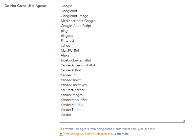 Настройки, расположенные на вкладке «Excludes» позволяют полностью отключить кэширование на определённых страницах или разделах сайта или исключить определённые куки. В пункте «Do Not Cache User Agents» можно отключить кэширование для различных User-agent, пример смотрите на изображении.