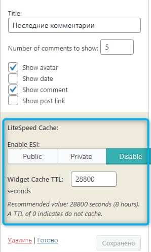 Раздел ESI предназначен для раздельного кэширования содержимого одной страницы. Например, на сайте используется виджет «Последние статьи» и при опубликовании нового поста содержимое всех страниц должно остаться закэшированным, тогда как сам виджет необходимо обновить. В пример также можно привести корзину WooCommerce и страницы аккаунтов. Если ESI не используется, то для каждого пользователя будет создан отдельная закэшированная страница, соответственно, возрастает нагрузка на сервер. Если же ESI включен, то будет использоваться общедоступный кэш с блоком ESI. Плагин позволяет настраивать отдельное кэширование для виджетов. В остальных случаях используйте PHP хуки LSCache для WordPress API.